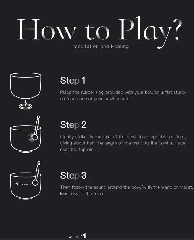 Steps to Play the Singing Bowl: Find a quiet, calm space for your practice Place the O-ring on a flat surface for larger bowls or hold smaller bowls in your hand Gently tap the outer rim and glide the mallet around the edge Maintain constant, firm pressure for a continuous ringing sound Practice to achieve the perfect sound, using light tapping pressure.